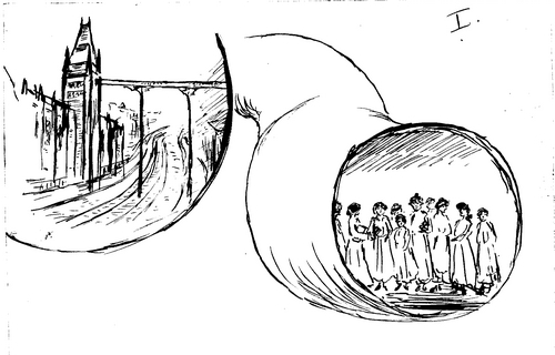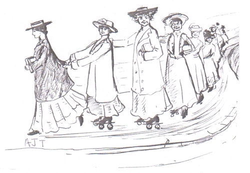 Preserved in the Ashburne archives are the first copies of the student magazine, Yggdrasill, the Norse Tree of Knowledge. Like the roots of the mythical tree, early Ashburnians hoped that the cause of women’s education would spread throughout the world. From 1899 till 1909 Yggdrasill was handwritten and hand drawn. Hence we find a poem, “Argument” * written by AJT in 1905, casting a whimsical eye on the lively debates in Ashburne House. Then there are the wonderful inventions of Alison, the physics student, trying to ease the life of her fellow Ashburnians with a pneumatic tunnel to whisk them down to Owens College, together with her early warning tea pot. Alison was evidently tired of coming back, cold and wet after a long session in her lab, only to find the Ashburne afternoon tea almost over. Her idea for little heated boots on wheels would also have cheered her fellow students.