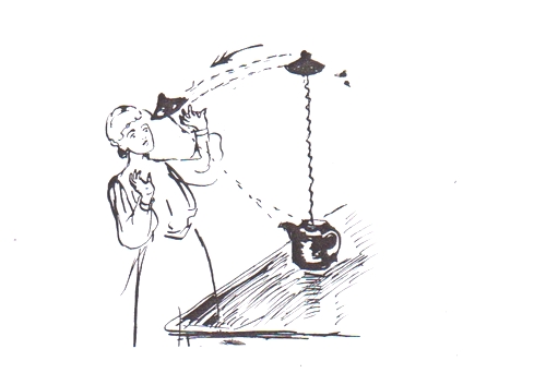 Another invention, specially recommended to the notice of Ashburnians, is a new kind of teapot, which fills a long-felt want. We all know by sad experience how aggravating it is, when coming in a little late for tea, to find all the teapots empty because they have not been duly filled up with hot water as they got low. In this new teapot, as soon as the water gets below a certain level, viz – three inches from the bottom, a spring shoots up the lid as in the illustration. We think that if this teapot were introduced into the house, people would be less likely to fill up the teapots.